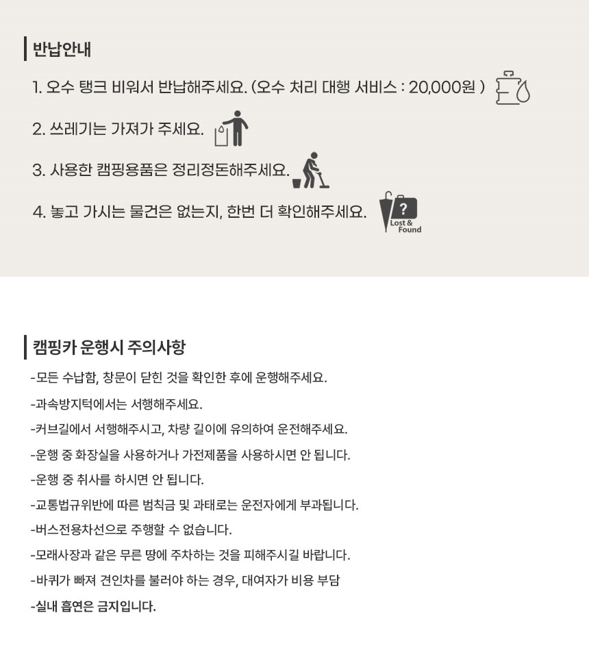 • 보험료 : 1일 2만원 [예시] 1박2일 대여 → 2만원 × 2 = 4만원