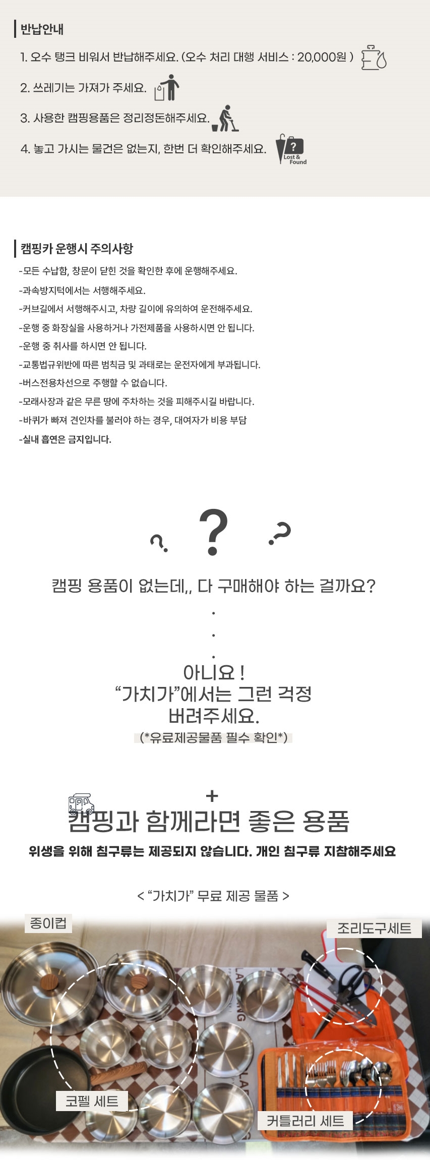 • 자차보험료 : 1박당 15,000원(예약시 자동으로 적용됨)